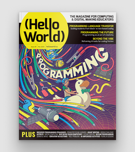 In Hello World issue 28, educators explore a range of topics related to teaching programming, such as how to help students transition from block- to text-based programming; stepping into the role of computer science educator with little to no prior programming experience; and insights from an introductory programming course which encourages working with, and not against, generative AI tools. This issue is packed with insightful research, practical advice, and thoughtful ways to best teach programming in your classroom.